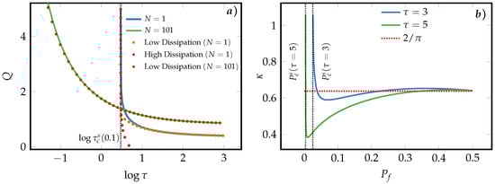 (a) Comparison between the dissipated heat of a SUB and a symmetric MLB () based on Arrhenius-rates units as a function of erasure duration for the optimal erasure protocol with . In addition to the full numerical solution of Equation (A21), the analytic low- and high-dissipation solutions in Equations (44) and (46) are displayed. The vertical dotted line corresponds to the logarithm of the critical time of a single microscopic unit for this specific erasure process. (b) Ratio between the erasure efficiencies of a symmetric MLB () and a SUB as a function of the final macroscopic probability for the optimal protocol with the erasure times . The red dotted line corresponds to the small-erasure and large-N approximation given by Equation (48) and the vertical black dotted lines represent the minimal erasure error .
