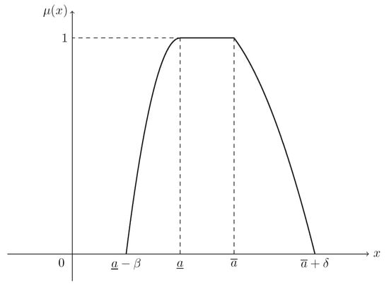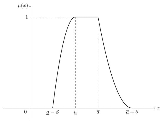 Example 1. Supposing that , then ξ is known as a trapezoidal fuzzy number, denoted by , and its MF is (see Figure 1) Example 2. If , then ξ is known as a parabolic fuzzy interval, denoted by , and its MF is (see Figure 2) Example 3. Suppose that . Then ξ is known as a normal fuzzy interval, denoted by , with (see Figure 3) Example 4. Suppose that and . Then ξ is known as a mixture fuzzy interval, denoted by , and its MF is (see Figure 4) Definition 3. (Liu and Liu [18]) Assuming that ξ is a fuzzy variable with MF, μ, and B is a set, the credibility of fuzzy event is defined by Definition 4. (Liu [38]) The credibility distribution (CD) of a fuzzy variable ξ is defined as As for an LR fuzzy interval