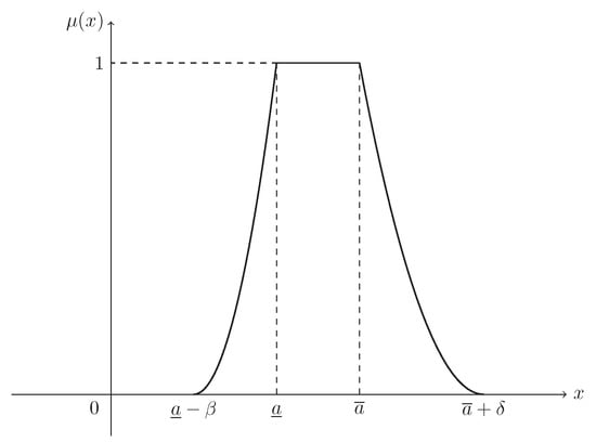 Definition 2. (Dubois and Prade [36]) A fuzzy interval ξ is of LR-type if there exist shape functions L (for left) and R (for right), and scalers with membership function (MF)which is denoted as , where is the core of ξ, and are respectively called the lower and upper modal values, β and δ are respectively called the left-hand and right-hand spreads. Remark 1. When , the LR fuzzy interval degenerate to an LR fuzzy number, e.g., a triangular fuzzy number or a Gaussian fuzzy number [37]. In other words, the LR fuzzy number is a special case of LR fuzzy interval discussed in this paper. For an LR fuzzy interval defined in Definition 2, the shape functions L and R determine its type, while the parameters determine its position and spreads. Examples 1–4 provide some commonly used LR fuzzy intervals with the same parameter setting and the different shape functions, including trapezoidal fuzzy numbers, parabolic fuzzy intervals, normal fuzzy intervals, and mixture fuzzy intervals. These fuzzy intervals will be used to illustrate our work in the following sections.
