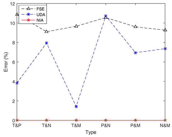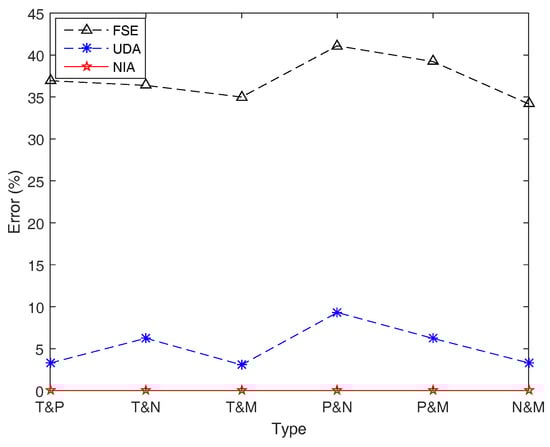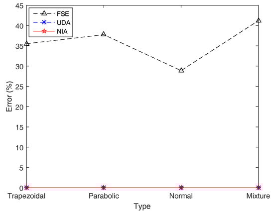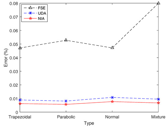 Figure 13, we can find that NIA has an overwhelming superiority on accuracy compared with the other two algorithms in this case, while FSE still performs worst with the maximal error 41.098743%. It is worth noting that the accuracy of UDA is reduced when the function
