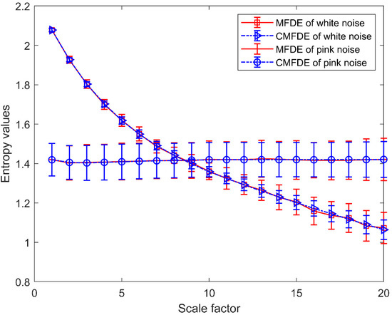 To verify the advantages of CMFDE, the white noise and pink noise are adopted to perform the comparison between MFDE and CMFDE. Here, 100 groups of white noise and pink noise with data lengths of 3000 points are generated.
