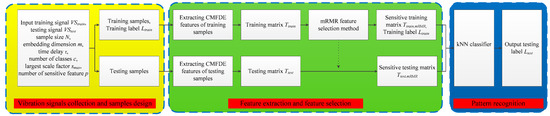 Step 2. Feature extraction and feature selection: CMFDE method is adopted to extract the fault features and to obtain the training matrix . The mRMR method is employed to choose the first p features to achieve the sensitive training matrix . Meanwhile, according to the ranking results in the training samples, the sensitive testing matrix can be obtained.