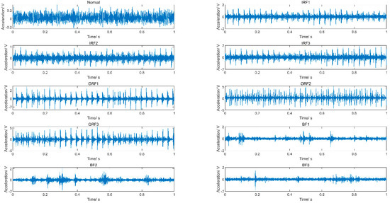 31]. The experimental bearing is 6203–2RS JEM SKF (SKF, Gothenburg, Sweden) at the fan end. The accelerometer is used for gathering the vibration signals. Vibration signals under 10 different conditions are collected, which are shown in