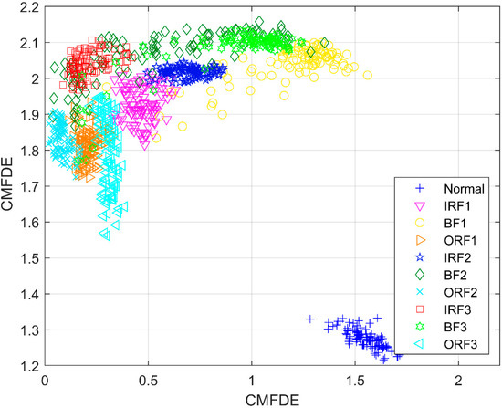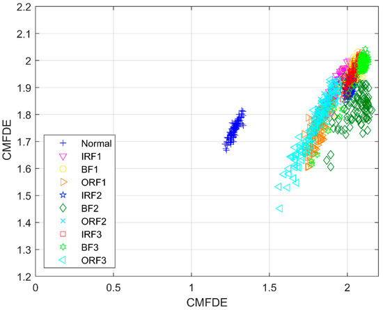 Figure 11, and different conditions can be easily recognized. In order to further verify the necessity of the mRMR method in MSE-mRMR-kNN, MPE-mRMR-kNN, MDE-mRMR-kNN, MFDE-mRMR-kNN, CMDE-mRMR-kNN, and CMFDE-mRMR-kNN, the first 10 scale factors of the original features are selected instead of applying the mRMR method and the new MSE-kNN, MPE-kNN, MDE-kNN, MFDE-kNN, and CMDE-kNN, CMFDE-kNN methods can be obtained. In order to reduce the impact of randomness, 50 run times are conducted under the same parameters used in