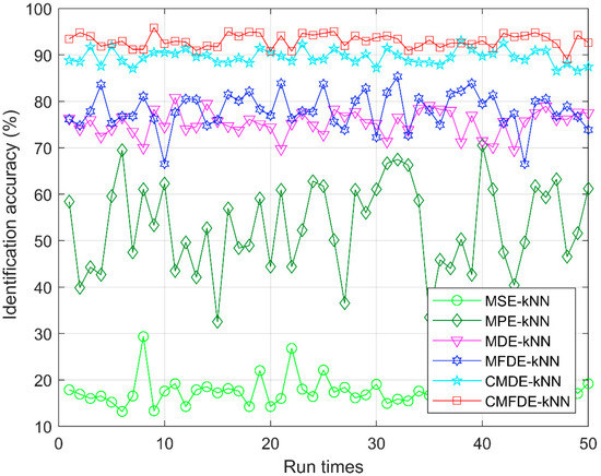 Table 2, the proposed CMFDE-mRMR-kNN method attains the highest identification accuracy (96.53%–93.06%). As demonstrated, the effectiveness of the CMFDE-mRMR-kNN method is validated, and the advantage of CMFDE in extracting sensitive features is also highlighted. Then, the SD of other methods is significantly larger than that of the proposed method, which shows that the proposed CMFDE-mRMR-kNN method has a better stability.