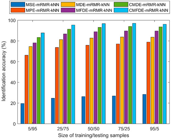 Figure 14, even though the number of training/testing samples is different, the proposed CMFDE-mRMR-kNN still obtains the highest average classification accuracy. Meanwhile, if the number of training samples is far less than that of testing samples (such as 5/95), the different methods obtain the least average identification accuracy. It can be found that, if there are sufficient training samples (such as 25/75, 50/50, 75/25, and 95/5), five different methods can achieve a higher average identification accuracy. However, excessive training samples could result in longer training computation time. Therefore, in order to achieve the balance between identification accuracy and computational efficiency, the number of training/testing samples is 25/75.