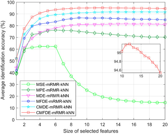 Figure 15. It can be found that the CMFDE-mRMR-kNN method can achieve much a higher identification accuracy, which verifies the superiority of the proposed method. Moreover, with the increasing size of the selected features, the identification accuracy is not always increasing, a too large or too small size of sensitive fault features will lead to a decline in the identification accuracy. The reason is that a too small size of sensitive features contains less fault information. On the contrary, a too large size of sensitive features will lead to a redundancy of fault information and a reduction of the identification accuracy. For MSE-mRMR-kNN, MPE-mRMR-kNN, MDE-mRMR-kNN, MFDE-mRMR-kNN, CMDE-mRMR-kNN, and CMFDE-mRMR-kNN, the optimal sizes of sensitive features are 4, 6, 15, 9, 17, and 12, respectively. The corresponding highest average identification accuracies are 62.34%, 76.26%, 81.49%, 86.70%, 91.71% and 95.20%, respectively.