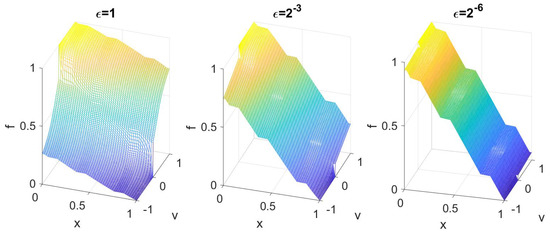 We furthermore plot the solution f as a function on the phase space. As shown in Theorem 2, in the diffusion limit, f loses its velocity dependence, and the solution becomes flat in v. This is seen numerically as well in Figure 2, which shows for different .