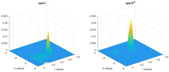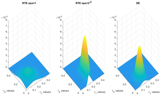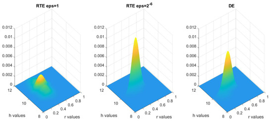 We first consider the solution to this problem in the one-level MCMC framework. The prior distribution is taken to be uniform in r from 0 to 0.5, and uniform in h from 8 to 12, and the variance of the noise is taken to be . With merely MCMC steps, one can already distinguish the distribution functions. As seen in Figure 5, the posterior distribution using the RTE model with is much more smeared out than the one with , and the posterior distribution using the RTE model with is significantly closer to that using the DE model.