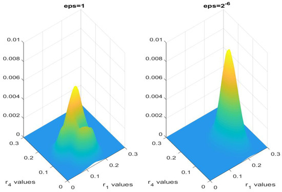 We also expect for small , distributions computed using the one-level MCMC should be similar to the ones computed using DE-assisted method. To compare them, we compute the Hellinger distance between the distribution based on the RTE computed using one-level MCMC for , in Figure 5 and the distribution based on the RTE computed using the DE-assisted MCMC for , shown in Figure 6. We obtain