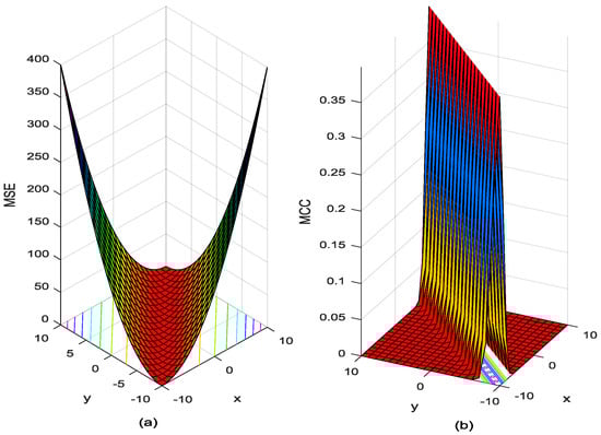 Performance surface of MSE and Correntropy: (a) MSE (b) Correntropy.