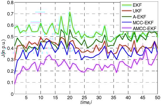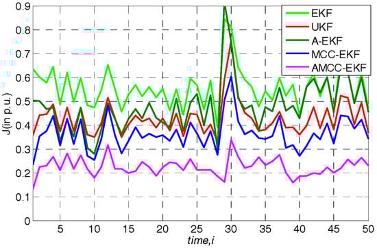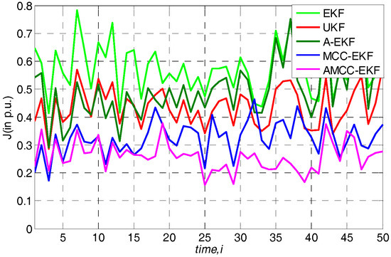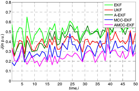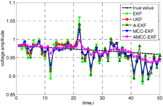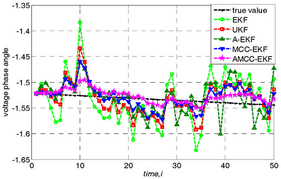 In general, the measurement noise is assumed for Gaussian noise, and we first evaluate the proposed algorithm in the normal environment. Loads are changed according to the above specified linear trend. The average overall performance of all algorithms in standard IEEE 30-bus is given in Table 1. From the results, we know that (1) both EKF, UKF and A-EKF algorithms have good performance in this case; (2) the adaptive mechanism can improve the estimation accuracy; (3) the performance of MCC-EKF is slightly better than that of EKF and UKF and the proposed AMCC-EKF performs better than other algorithms which illustrate that on the one hand, the correntropy is robust for the noise, on the other hand, the adaptive mechanism The adaptive mechanism makes the algorithm have stronger tracking performance by updating the predicted error covariance matrix and measurement noise covariance matrix.