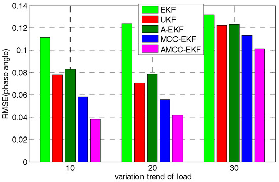 Furthermore, to test the effect of load change on the proposed algorithm, we changed the linear variation trend of load and consider 10%, 20%, 30%, respectively. The mean absolute error and root mean square error of voltage angle of no.3 bus in IEEE 30-bus in different variation trend of load are shown in Figure 8 and Figure 9, respectively. It can be seen from the bar chart that although the error of the proposed algorithm increases with the linear variation trend of the load, the error of the proposed algorithm is minimal compared with other methods.
