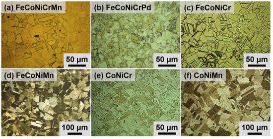 Optic images of (a) FeCoNiCrMn, (b) FeCoNiCrPd, (c) FeCoNiCr, (d) FeCoNiMn, (e) CoNiCr, (f) CoNiMn alloys annealed at 900 °C for 1 h.
