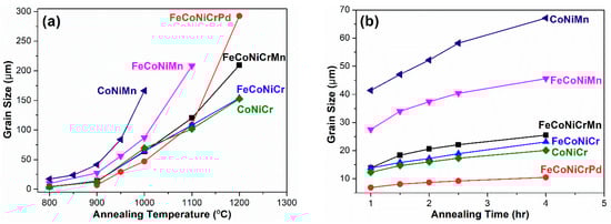 (a) Grain size evolution of all high/medium entropy alloys annealed at different temperatures for 1 h. (b) Grain size evolution of all high/medium entropy alloys annealed at 900 °C for different times.