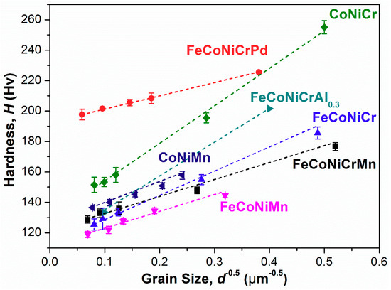 Hardness H as a function of grain size d for all high/medium entropy alloys annealed at different temperatures for 1 h to study the Hall–Petch relationship.