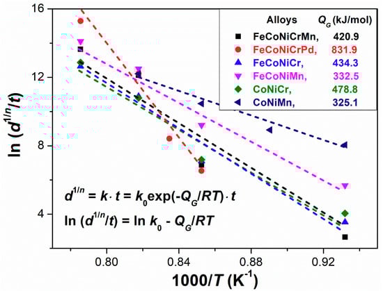 where R is the gas constant, QD is the activation energy for diffusion, and D0 is the intrinsic diffusion constant. According to Table 5, the QG values of different alloys decrease with increases in the D value and show little relation to the QD values. It is reasonable that the high D value can enhance the grain growth, which is a diffusion-dependent process for the movement of grain boundaries, thereby causing the low QG value. Previous studies have shown that the element Mn in FeCoNiCrMn HEA has the highest diffusion rate among all the constituent elements [59,60]. Therefore, according to Table 5, the substitutions of Mn for Cr in CoNiCr and FeCoNiCr alloys can lower the QG values; i.e., CoNiCr (478.8 kJ/mol) → CoNiMn (325.1 kJ/mol); FeCoNiCr (434.3 kJ/mol) → FeCoNiMn (332.5 kJ/mol). In addition, the addition of Mn into FeCoNiCr alloy can also decrease the QG value; i.e., FeCoNiCr (434.3 kJ/mol) → FeCoNiCrMn (420.9 kJ/mol). These results reveal the important role of Mn in affecting the QG value by increasing the diffusion rate of alloys. Note that the lattice distortion δ is also related to the diffusion coefficient shown in Table 5; it can be presumed that the diffusion would decelerate due to the lattice distortion hindering the movement of the atoms.