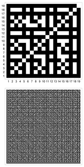 Note that and . The correlation matrix for the coprimality condition is shown in Table 1. Clearly, whenever , the matrix is simply the autocorrelation of a k-length sequence. The indicator function allows us to identify hidden symmetries between two given sequences. In particular, any element of can be mapped into black and white pixels as follows: