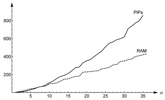 Thus the comparison of asymptotic equivalences (8) and (9) assures us that the distribution of Ramanujan primes goes to infinity faster than the k-order PIP distribution. In addition to illustrating the asymptotic behavior, the comparison between k-order PIPs and Ramanujan primes for finite values of x is of interest. Fix a PIP h and consider the subset of given by of cardinality n. Figure 4 suggests that the PIP distribution increases more slowly than that of Ramanujan primes, except the values . All simulations have confirmed this assertion up to . Clearly, this is only an empirical clue and far from being a conclusive proof. Summarizing, we may formulate the following