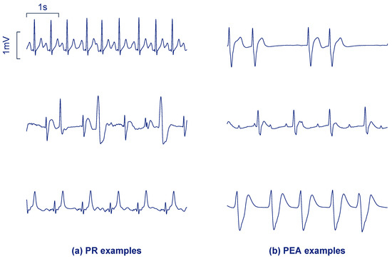 Segments of 5 s corresponding to pulsed rhythm (PR) (a) and pulseless electrical activity (PEA) (b) from the study dataset.