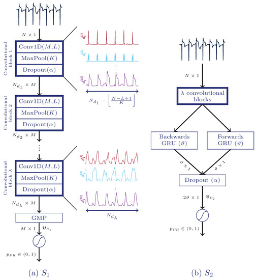 Architectures of the proposed deep neural networks. The fully convolutional solution (), (a), is fed with an electrocardiogram (ECG) segment of N samples and includes up to convolutional blocks, a global maximum pooling layer (GMP), and a final fully connected layer which provides final likelihood of PR, . The solution, (b), includes up to convolutional blocks, a bidirectional gated recurrent unit (BGRU), an extra dropout layer, and a fully connected layer.