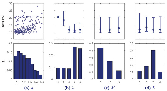 Figure 4 shows the results of BO-TPE for . Increasing overfitted the model rapidly and BER was minimum for ; less convolutional blocks did not provide detailed enough features and increasing overfitted the model. Another influential hyper-parameter was , which showed minimum BER values around . The hyper-parameters M, L, and had little effect on BER.