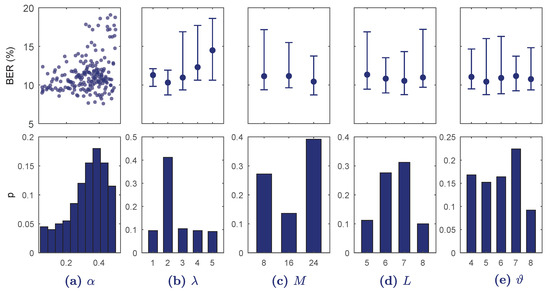 Results of the BO-TPE optimization algorithm for every hyper-parameter range in . On the top BER is shown for each continuous value (a) or for each discrete value as median and 10–90 percentiles (b–e). The bottom figures show the probability of selection of the hyper-parameter values in the BO-TPE algorithm.