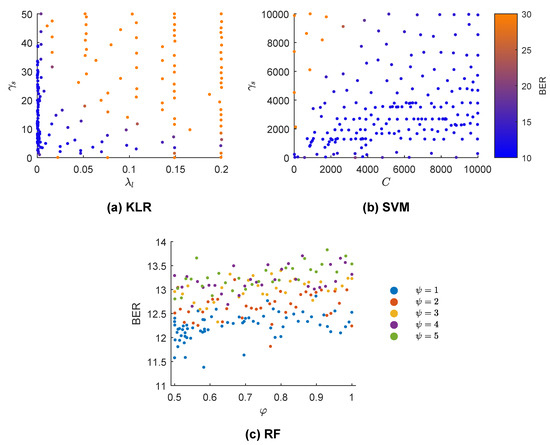 Bayesian optimization with Gaussian processes (BO-GP) results for three different machine learning models. The BER is color-coded in (a,b) (kernel logistic regression (KLR) and support vector machine (SVM) classifiers) and each point represents the selected solution of the BO-GP in some iteration. In (c) (random forest (RF) classifier), discrete values of are color-coded and BER plotted for a range of values for .
