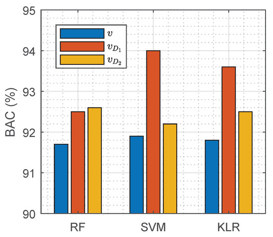 Comparative analyses were performed between the 9 hand-crafted features of the baseline models () and the features learnt by DNN solutions and ( and respectively). The area under the curve (AUC) for ranged between 0.88 and 0.94, showing that they had been wisely selected in different domains as described in [34]; but the features () that extracted reported high discriminative values from 0.61 to 0.97, showing that the deep architecture found some very selective features. Next, feature sets from the deep learners and were fed into the baseline classifiers to compare their performance with that of the original . The BO-GP optimization procedure was repeated for the RF, SVM, and KLR classifiers and results for the test set are depicted in Figure 6. Training the classifiers with and yielded higher BAC values than those obtained with the pre-designed features. This experiment shows that features defined by the neural networks integrate information not considered by the hand-crafted features, and that they can be successfully used with other classifiers.