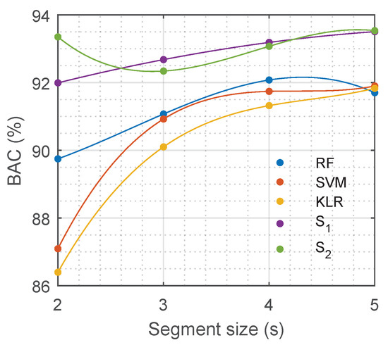 Table 2 shows the overall test results of the baseline models and the deep learners in terms of Se, Sp, and BAC, and the set of selected hyper-parameters tuned during the optimization process. There were no differences between the RF, SVM, and KLR models, and any of the deep learning solutions outperformed the baseline models by nearly two percentage points of BAC. Although there was no difference in performance between and , the training process of is simpler with less trainable parameters than (1441 vs. 4777).