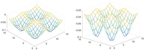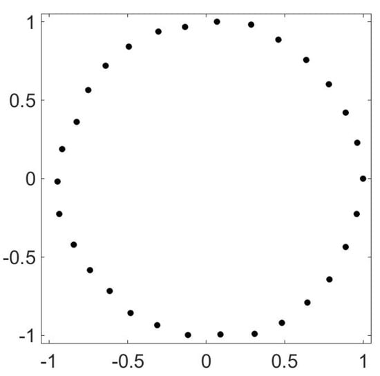 Brownian motion on various configurations without a potential [] is an example of this situation. Consider Brownian motion on N points arrayed in a circle. The transition probabilities for this can be taken to be all ′s and zeros. The ′s are just above and just below the diagonal, as well as in positions and . This matrix can be diagonalized exactly and its eigenvalues are . The first two non-trivial (i.e., not all ones) left eigenvectors can be taken to be and . Now the punch line: plot versus and you get Figure 5.