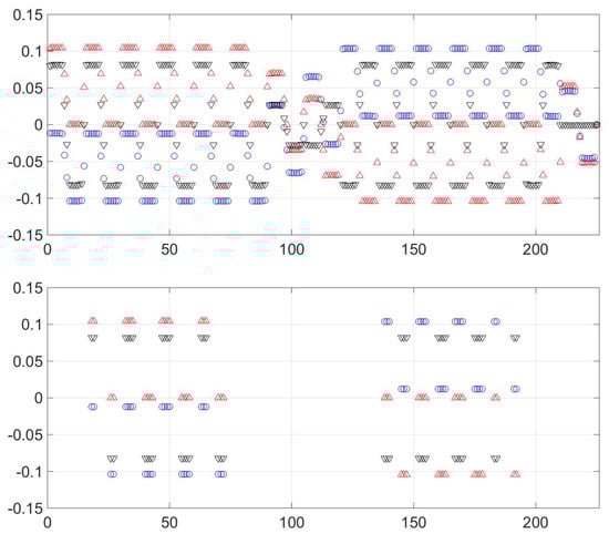 The first three left eigenvectors, pictured as blue circles, black downward pointing triangles and red upward pointing triangles. The upper figure shows all points, the lower shows only those with greater than . The x-axis is a number assigned to each of the 225 points and can be considered arbitrary. As can be seen—also in Table 1—only 10 values of the left eigenvectors have significant weight. This allows each phase to be characterized by the unique A values that characterize that phase.