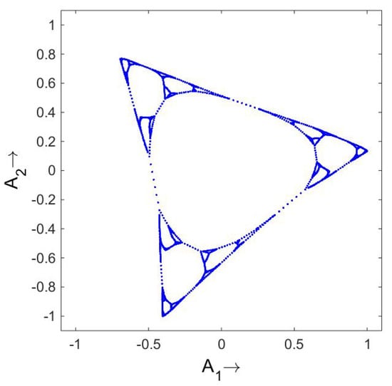 A proof of the simplex property is a bit complicated and for a full proof the reader is referred to []. (In that paper “m” is what is here called .) For the proof is simpler although even in this low dimension some preparation is needed. First, by the basic orthogonality relation. Since (as usual) we assume irreducibility, we know that is strictly positive. It follows that there is a positive maximum value of , call it and (one of) the point(s) where it takes that value . Similarly there is a negative minimum value, call it and define analogously. Now take as your initial point . In other words . Evolve it for T time steps. Clearly almost all points remain in the relevant phase, which follows from the spectral expansion. What we do know is that