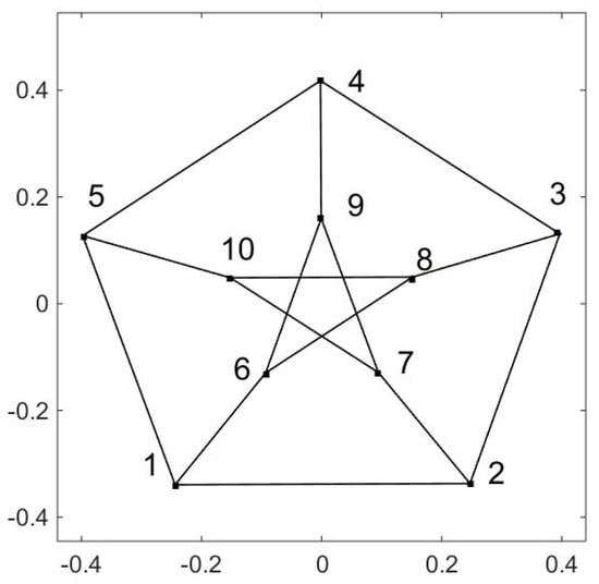 The Petersen graph. Note that there is no intersection in the interior pentagon; e.g., the line 6–8 does not touch the line 7–10. This graph cannot be embedded in a plane.