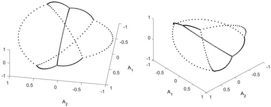 A sharp transition, whose explanation eludes me. On the left is the OR (a plot of for all ) for the same potential that is pictured in Figure 1, but at a higher temperature ( the temperature used in Figure 2). At this higher temperature I know of no reason for the points to form a tetrahedron, but they do. The probabilities of non-vertex points is higher (so the large symbols are far more common) but the shape of the convex hull is still a tetrahedron. Then, with a tiny fraction of temperature change (), the figure changes completely—roughly to a ball. The probabilities () of individual points do not change (significantly), but the OR becomes dramatically different.