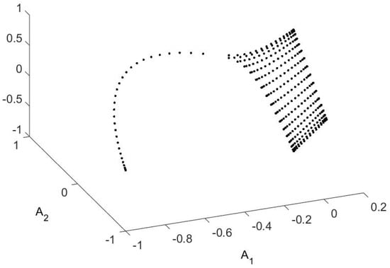 The matrix R implements the rules just stated and can be diagonalized to yield eigenvalues and left eigenvectors. What is important is how close the eigenvalues are to 1, and for the example given the first five differences are (for ). Note the increase in at . As we shall see, this suggests a 3-dimensional plot of the first 3 (non-trivial) left eigenvectors. This is shown in Figure 2.