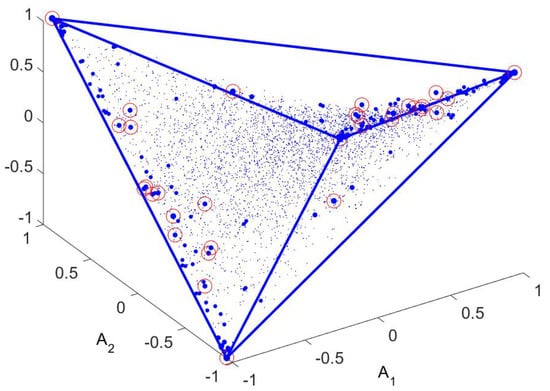 The OR for a random walk at low temperature in the 4-minima potential. This is a plot of the three first non-trivial left eigenvectors of the matrix R of transition probabilities, i.e., vs. vs. for each space of positions. These are the three axes of the figure. For each there is a certain probability of being found in the stationary state (). Different symbols are used for different categories of points, x. The largest probabilities are given the largest symbols, and these coincide with the extremal points (vertices) of the tetrahedron. Other points have smaller weight (values of ) and are given smaller symbols (mostly red at this temperature, but some intermediate sizes, with green symbols, almost at the vertices). The convex hull of the points, which is the pictured tetrahedron, is shown as a guide to the eye. See the main text for further explanation.