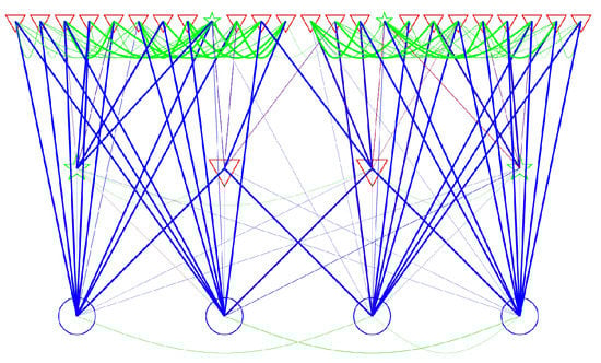 Transitions between phases. The phases are sorted (based on measured lifetimes) into 3 categories, long-, medium- and short-lived. On the lowest level are the longest-lived, etc. The symbol and color correspond to the amount of inflow. A phase’s left-right position follows the values of that phase’s nucleus among phases at the same lifetime level. Lines indicate transition probabilities, with line width a monotonic function of transition probability. Blue lines are flow from higher (shorter lifetime) levels to lower, red go oppositely, and green represents lateral transitions.