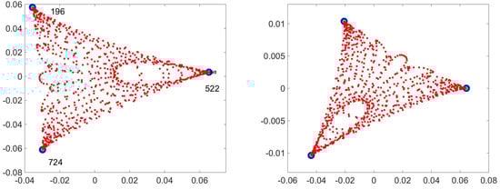 Another case in which taking the real and imaginary part works is a walk in a potential. On the left of Figure 15 is the OR for a walk in a potential with 3 minima. For this walk [] it is found that the extrema of the triangle are are the points numbered 196, 522 and 724 (the stochastic matrix is 961-by-961 (). In the right hand figure I’ve added a term that allows a travel shortcut between the minima, a matrix connecting the three extrema. This makes the eigenvalue complex and induces a current. The right hand figure of Figure 15 uses the real and imaginary parts of the first non-trivial eigenvector. As you can see, it is (essentially) the same diagram. This does not always happen, but in this case it did.