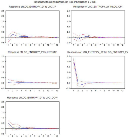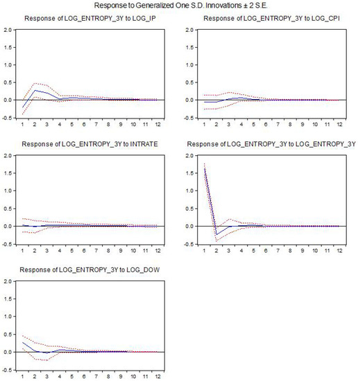 Compared to the results when using the simpler bivariate Granger causality tests, we see that the industrial production leads again to significant responses in entropy, while the inflation rate does not significantly impact it. There is a positive impact by the interest rate, although barely statistically significant. However, the DJIA index has a significant impact, although the results for the Granger causality tests were quite weak. The two frameworks are, however, not fully comparable since the VAR framework is multivariate and uses a certain procedure for identifying the structural shocks, while the Granger causality test is a simpler bivariate framework.