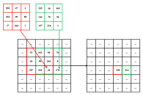 The modified filtering can be applied to image encryption, according to the very recent work BSIF by Hua and Zhou [51]. However, the BSIF does convolution on each pixel in an image with a fixed kernel generated from a random sequence. Li et al. used a or variable kernel to convolute each pixel in an image, that is to say, the kernels associated with each pixel for convolution are different, so-called dynamic filtering [6]. The experimental results demonstrated the effectiveness of dynamic filtering. A reasonable assumption is that a dynamic kernel with larger size (e.g., or ) will lead to better encryption. An example of dynamic filtering with two filters is shown in Figure 3, where the red kernel and the blue kernel are conducted on the pixels of 34 and 178 in the plain image, and the results of dynamic filtering will be 140 and 214 in the cipher image, respectively. We can see that with dynamic filtering, the values of pixels in the plain image are changed, and this procedure can be reversible [51]. Therefore, we can use this operation for diffusion.