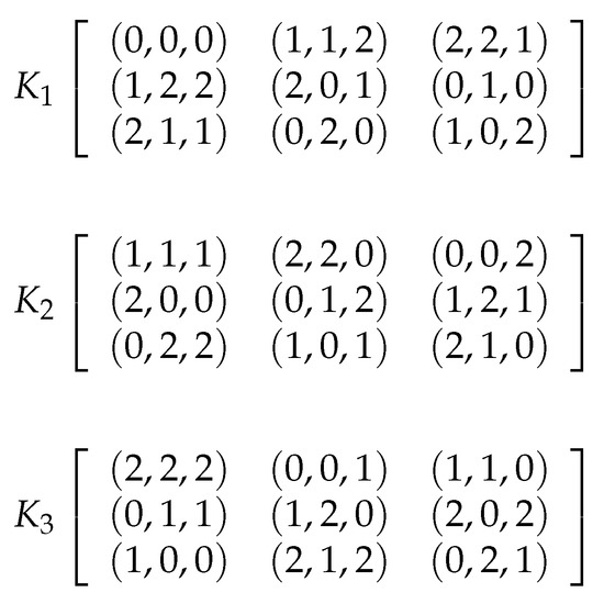 where is the index of the Latin cube, and “+” and “×” are the addition and multiplication in , respectively [56]. Figure 4 shows three Latin cubes of order 3 on the set , named as , , and . When we superimpose the same position of three Latin cubes on the set S, if each combination occurs only once, we can say these three Latin cubes are orthogonal. For example, when we combine the three Latin cubes , and , each of the 27 combinations occurs only once, so they are orthogonal. By combining , and , we can get a new cube K shown in Figure 5. Then a spatial permutation is obtained: , i.e., the element in the left position is transferred to the right position. More generally, , where s is the index of K (or L), and i and j are the indices of the row and the column, respectively.