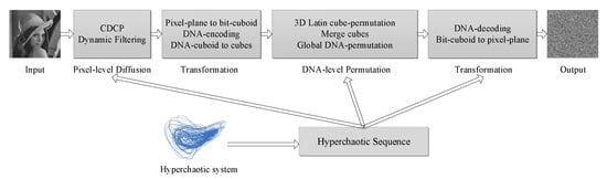 The DFDLC is conducted on pixel-level diffusion and DNA-level permutation. Specifically, regarding pixel-level diffusion, we mainly apply dynamic filtering on each pixel in a plain 2D image. We also used the ciphertext diffusion in crisscross pattern (CDCP) to improve the diffusion results [60]. For DNA-level permutation, we mainly use Latin cube to change the position of each nucleic acid. In addition, a kind of global DNA permutation similar to the global bit permutation is adopted for DNA permutation [6]. The proposed DFDLC is illustrated in Figure 6. With the hyperchaotic sequence generated by the 5D chaotic system, the main steps of the DFDLC are as the following: hyperchaotic sequence generation, pixel-level diffusion, pixel-to-DNA transformation, DNA permutation, and DNA-to-pixel transformation.