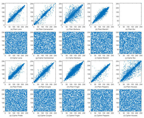 Then, we randomly select 4000 pairs of horizontally adjacent pixels from each plain image and its corresponding cipher image to plot the distribution maps of the grayscale levels of the adjacent pixels, as shown in Figure 9. It can be seen that the correlation of natural images is so strong that the grayscale levels of the adjacent pixels are concentrated near the diagonal line. The figure of the plain Bw is a special case because its distribution has only two possible combinations, i.e., and . The strong correlation of all the plain images is thoroughly destroyed by the proposed DFDLC so that the grayscale levels of adjacent pixels are evenly distributed over the entire plane. It further demonstrates that the DFDLC has good performance regarding correlation.