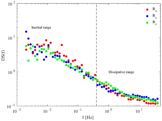 Degree of stationarity (DS) of the three different magnetic field components during the selected time interval. The dashed line refers to the Doppler-shifted ion cyclotron frequency ( Hz).