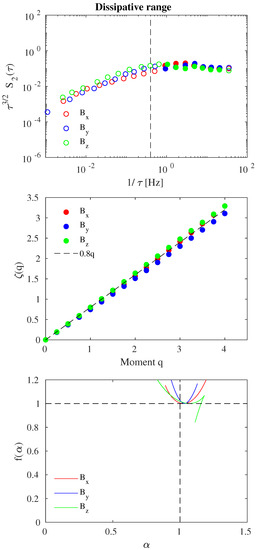 A clear different behavior is found when approaching the dissipative range (see Figure 4), i.e., moving towards higher frequencies ( Hz). A different scaling law is recovered, moving to a greater scaling exponent ( and, consequently, a steeper slope for the energy spectral density, decaying as , is recovered. This suggests that different physical processes operate inside this dynamical regime occurring on small scales. From a fractal point of view, magnetic field fluctuations at kinetic/dissipative scales seem to behave as a monofractal system with a Hurst exponent (i.e., ) ∼ 0.8 [52,53], quite similar for all magnetic field components (Figure 4, middle panel). This behavior is confirmed by the singularity spectrum (see Figure 4, lower panel) which collapses near the point . Our findings suggest the absence of intermittency at dissipative scales, which is well in agreement with previous works where generalized Hilbert spectra were used [52,53,54].