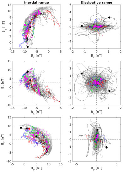 Figure 6 reports the phase-space portraits for the two different dynamical regimes, i.e., inertial scales (left panels) and kinetic/dissipative ones (right panels). The different symbols identify different phase-space trajectories starting at different phase-space positions, identified by a black symbol, and ending with a magenta one. The results look quite interesting and can be interpreted in dynamical system framework.
