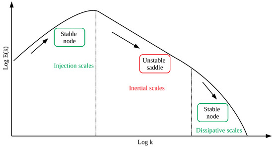 The obtained results seems to suggest a new view of the dynamics of the solar wind at different scales from the MHD/inertial domain down to the kinetic/dissipative one. The system undergoes a saddle-node bifurcation, a local bifurcation in which two fixed points collide and annihilate each other, with an unstable fixed point (saddle) and a stable one (node). This means that both the inertial and kinetic/dissipative ranges can be seen as fixed points of the governing system equations, one unstable and the other stable. In this way, the phenomenological model of the Richardson cascade [24,26,28,29] can be interpreted in the different context of the dynamical system theory. Energy is injected at a scale L, which represents a stable fixed point of the system; then, when nonlinear interactions develop, corresponding to changes in one or more dynamical bifurcation parameters, the dynamics of the system changes, moving towards an unstable fixed point (i.e., the inertial regime) which, due to its repeller nature, forces the system to explore the available phase-space until a stable fixed point (i.e., the kinetic/dissipative domain) is reached (Figure 7). In a simple conceptual model, a bifurcation parameter could be the timescale of the different processes operating inside the MHD/inertial and kinetic/dissipative domains such that the dynamics of the system, represented in our case by the magnetic field components , can be seen as solely dependent on
