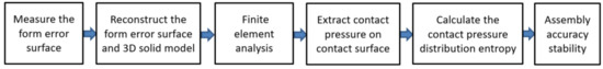 First, a series of measuring points characterizing the form error surface are measured using a coordinate measuring machine (CMM). The form error surface is then obtained by point cloud fitting, and fused with the 3D solid model to obtain a geometric model with form error, the modeling method of the form error model is present in [14]. Further, finite element analysis with the form error is performed, and the contact pressure of the nodes on the form error surface are extracted from the simulation results. The contact pressure distribution entropy is calculated by the method presented in subsection 2.2. The prediction results of the assembly accuracy can be obtained by comparing the contact pressure distribution entropy. The greater the contact pressure entropy and the more uniform the contact pressure distribution, the higher and more stable is the assembly accuracy.