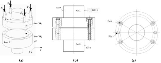 Contact pressure is a parameter in contact mechanics and has a wide range of engineering applications. Contact pressure distribution can affect the friction properties of the contact interface [15], so it is also used in the design of the bearing [16,17]. Zhang et al. [18] designed a safety factor based on the contact pressure for the interference assembly of the gears, which improves the assembly accuracy of the gear assembly. Peng et al. [19] conducted a finite element simulation study on the assembly of fuel cells. The assembly error affects the assembly performance of the fuel cells by affecting the distribution of contact pressure. The study also gives the maximum assembly error allowed for fuel cell assembly. Deguchi et al. [20] developed a pressure sensitive sensor to measure the pressure distribution in imprint lithography. The pressure distribution on the wafer surface can affect the deformation of the wafer and cause dimensional errors on the pressed wafer. In the bolt connection, the connection strength and deformation of connected parts are affected by the contact pressure distribution [21,22,23]. Contact pressure distribution affects the thermal conductivity of the contact surface and is also used in thermal error analysis of machine tool assemblies [24,25]. Tyfour et al. [26] conducted an experimental study on the contact fatigue of the rail and found that the maximum contact pressure is the main reason for the failure of the rail contact surface. In the above studies, the contact pressure has two main effects on the contact surface. On one hand, it affects the contact deformation so that the relative positional relationship between the contact surfaces changes, such as [15,16,17,18,19,20]. On the other hand, it affects the mechanical strength of the connected parts by affecting the transmission of the contact force between the contact faces, thus affecting the ability of the assembled part to resist deformation caused by external forces, such as [21,22,23,24,25,26].